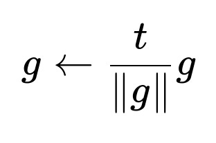 This means if the total norm exceeds t, we shrink g so that its new norm is exactly t. This is preferred in many situations because it preserves the direction of g but limits its magnitude. For smaller norms (below the threshold), the gradient remains unchanged. This avoids outliers in the update step.