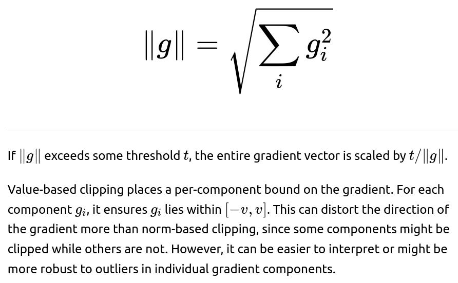 Local (per-layer) clipping: You compute the gradient norm for each layerâs parameters separately, then clip each layerâs gradients if they exceed a certain threshold. This can be useful if some layers systematically produce larger gradients than others. For example, an embedding layer might produce extremely large gradients due to certain tokens or outliers in language modeling, while other parts of the network have stable gradients. By clipping only the problematic layer, you avoid over-constraining the rest of the network.