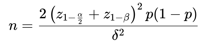 Here n is the required sample size per group in an A/B test, p is an estimate of the baseline proportion (for example, the proportion of users who restore files from the trash after 30 days), δ is the minimum detectable difference you care about (the smallest change in that proportion that you want to be able to detect with statistical significance), z is the quantile of the normal distribution, α is the significance level (commonly 0.05), and β is the Type II error rate (related to test power, commonly 0.2 or 0.1).