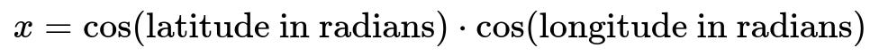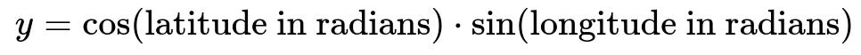 Another common strategy is to place each (latitude, longitude) pair on a 3D sphere, which can be viewed as embedding them into Cartesian coordinates (x, y, z). Specifically: