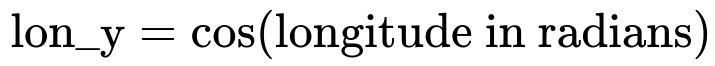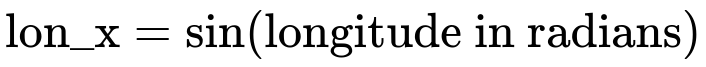 2D cyclical (sin/cos for latitude and longitude): Results in four extra features (lat_x, lat_y, lon_x, lon_y) if you separate them out, or sometimes you might only transform longitude if you only care about one cyclical dimension.