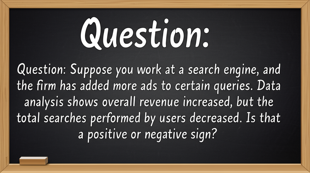 ML Interview Q Series: Is increased revenue but decreased user searches after adding more ads a positive or negative outcome?