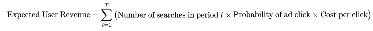 One detailed way to interpret this scenario is to analyze lifetime value (LTV) of a user. Suppose we define total revenue from a given user over an extended period as a function of how many searches they conduct, how often they click ads, and the cost per click the advertiser pays.