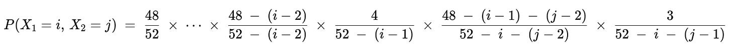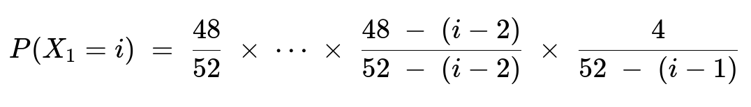 P(X₁ = i) = (48/52) × ... × [48 − (i−2)] / [52 − (i−2)] × [4 / (52 − (i−1))].