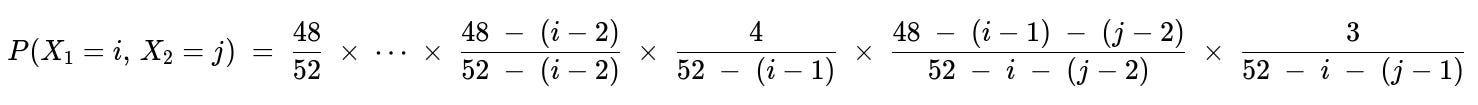 P(X₂ = j | X₁ = i) = product of [ (48 − (i−1)) / (52 − i), (48 − (i−1) − 1) / (52 − i − 1), … ] until j−1, then × [3 / (52 − (j−1)) ].