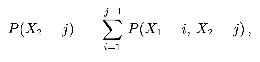 P(X₂ = j) = ∑ (from i=1 to j−1) P(X₁ = i, X₂ = j).