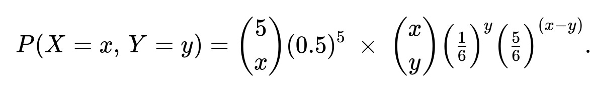 Imagine we still have X ~ Binomial(5, 0.5), but then we do something more complicated for Y. For instance, if we roll a 6-sided die X times, and define Y to be the count of outcomes that equal 6 (probability 1/6 each roll). Mathematically: