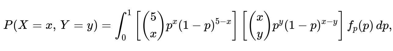 where f_{p}(p) is the prior for p. If that prior is Beta(α, β), it updates to Beta(α + x, β + 5 - x) after observing X.
