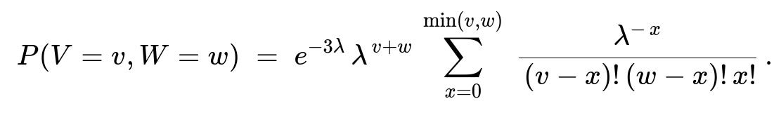 \huge P(V = v, W = w) = \sum_{x=0}^{\min(v,w)} e^{-\lambda} \frac{\lambda^{v - x}}{(v - x)!} ; e^{-\lambda} \frac{\lambda^{w - x}}{(w - x)!} ; e^{-\lambda} \frac{\lambda^x}{x!} = e^{-3\lambda} \sum_{x=0}^{\min(v,w)} \frac{\lambda^{(v - x) + (w - x) + x}}{(v - x)!(w - x)!, x!}. ]