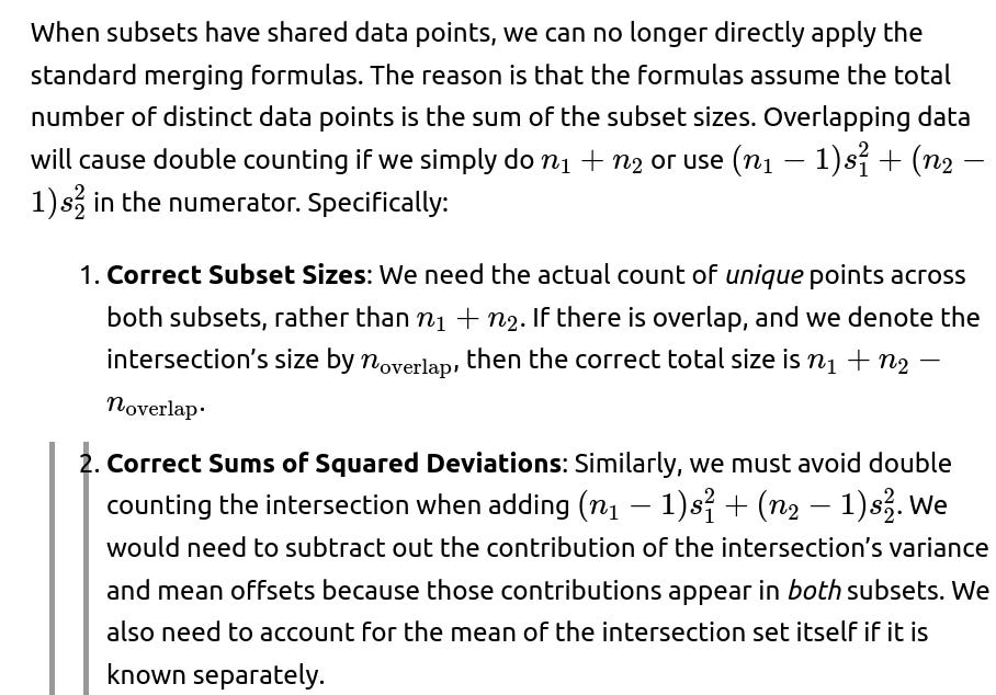 Practical Pitfalls: Often, real-world merging of partially overlapping subsets can arise when data has been aggregated in multiple ways, or there is a time-based overlap. This is not purely a theoretical scenario but can happen if logs or partial aggregates have been stored with some duplication. If you do not carefully handle it, you might underestimate or overestimate the variance.