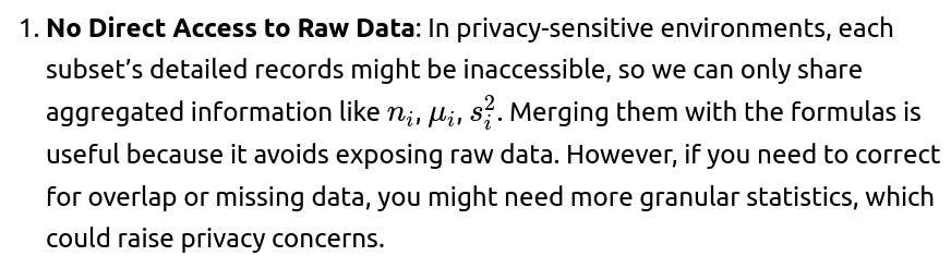 4. Consistent Approach: Ideally, if missingness is present, one might unify the data-cleaning/imputation strategy across all subsets before merging. Alternatively, store the raw or partially imputed data, then compute the final mean and variance from the combined data after a single consistent data preprocessing step. If you only have summary statistics and do not know how missing values were handled, the reliability of combined statistics can be questionable.