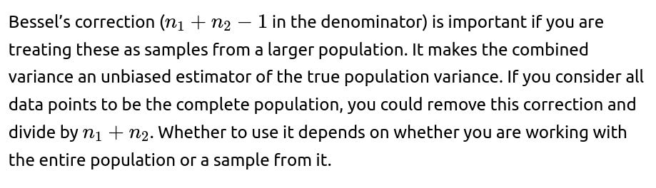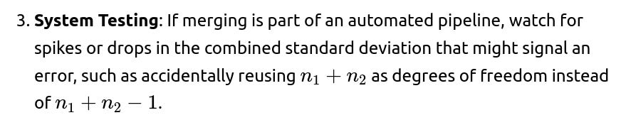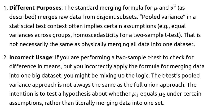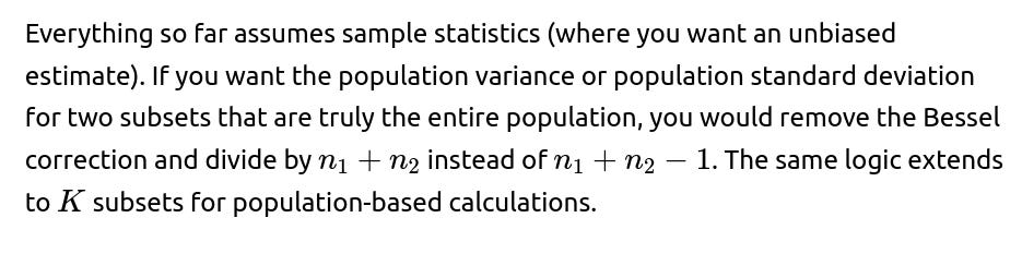 Edge Case: If your reason for combining subsets is for a statistical test, be aware that different formulas or test-specific pooled estimates might be needed. So if you are dealing with a scenario that calls for a classical two-sample t-test with an assumed common variance, it’s not the exact same formula as physically combining all points into a single dataset and computing a variance that way.