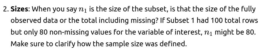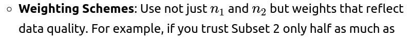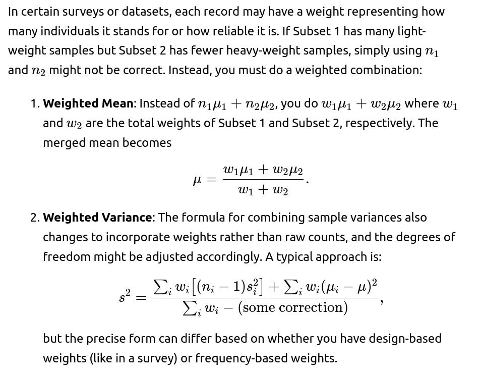 Edge Cases: In real-world scenarios, these methods can cause confusion. For instance, if Subset 2 is artificially “down-weighted,” the final combined mean might not reflect a simple average. This can be acceptable if the goal is to reduce the impact of suspect data. Always clarify what “combined statistics” mean in such a situation and whether your approach is truly unbiased or a heuristic to handle data-quality concerns.