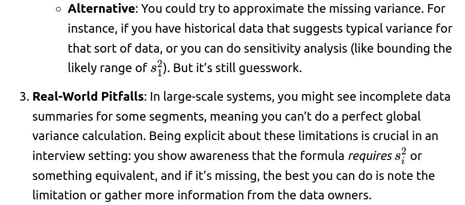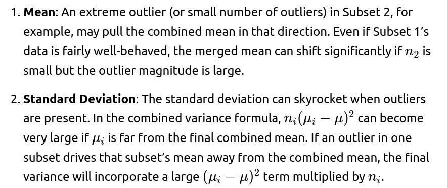 Edge Cases: If there is only one extreme outlier in a subset of moderate size, it might not drastically shift that subset’s mean. But if the subset is small and the outlier is extremely large, the effect on the combined statistics could be considerable. Interviewers often ask about the resilience of these formulas to real-world messy data, so it’s important to highlight that the formula itself is correct but might not be robust in the presence of severe outliers.