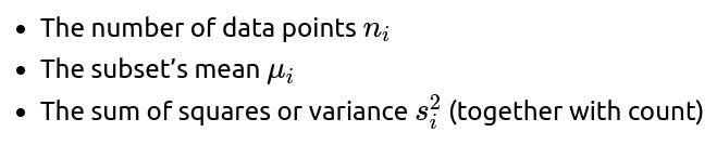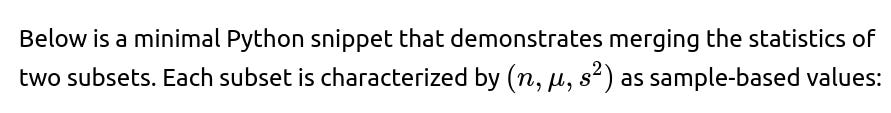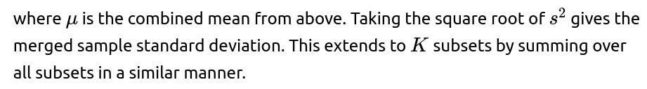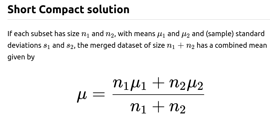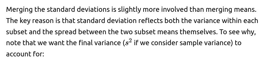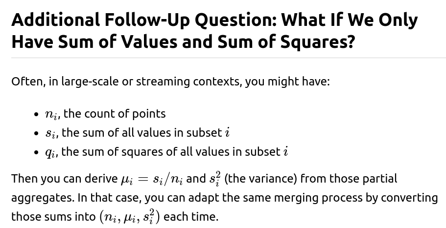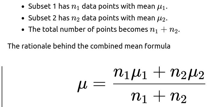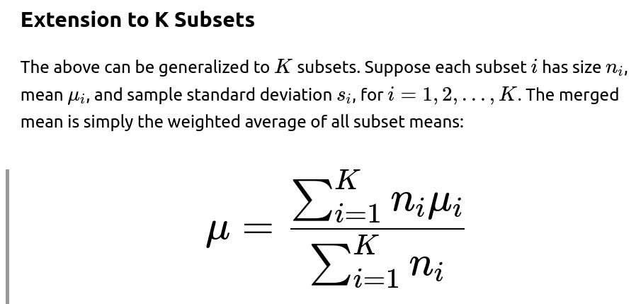 you can merge partial aggregates iteratively. This is often referred to as a “parallelizable” or “online” way of calculating statistics. It is especially useful in large-scale machine learning or distributed systems, where you do not want to gather all data in one place just to compute basic statistics.