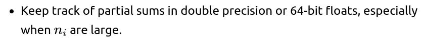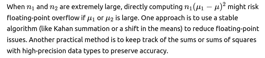 In real implementations (e.g., streaming algorithms or large-scale data processing), numerical stability can become an issue if the means are very large or very different from each other. To mitigate floating-point problems: