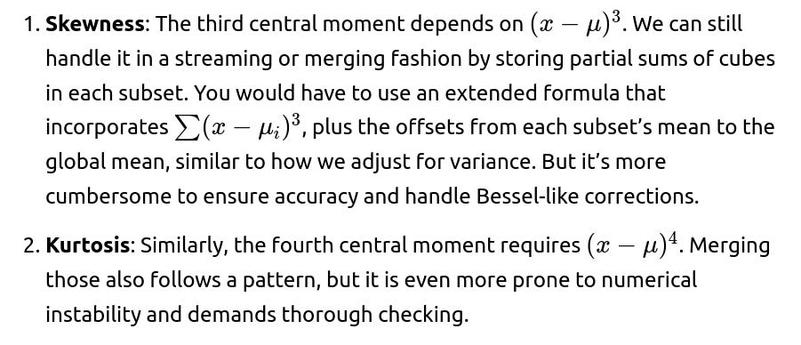 Practical Usage: In some advanced big data or stream processing tasks (e.g., anomaly detection or advanced distribution fitting), capturing higher-order moments can be valuable. Just be aware that each additional moment increases complexity, and merging them can become prone to floating-point rounding issues for large sums.