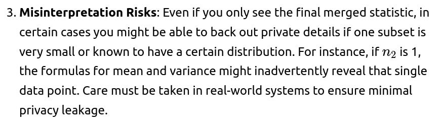 Differential Privacy: If each subset has added noise to maintain differential privacy, merging might combine the noise in non-trivial ways, potentially skewing the combined mean and standard deviation. Specialized knowledge of how to handle differential privacy across multiple data partitions is required.