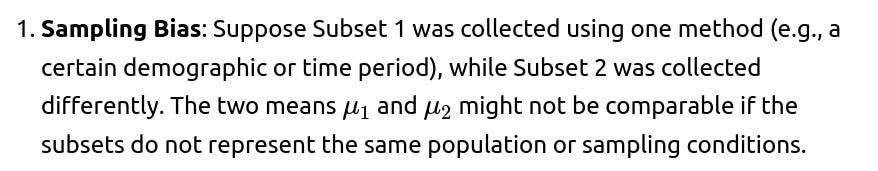 2. Data Quality Differences: If one subset is known to be noisier or of lower fidelity, combining it blindly with a higher-quality subset could degrade the overall data’s reliability. Standard deviation might be inflated by the noisy subset.