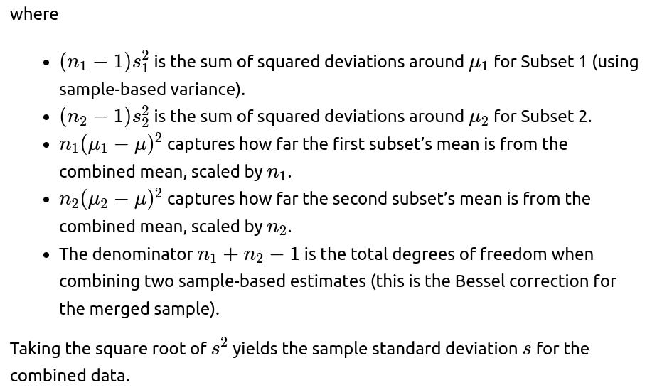 You Cannot Fully Combine Variances: To use the standard merging formula for standard deviations, you need each subset’s variance or at least enough information to compute it (like sums of squares). If one subset has no variance information, you cannot compute the final variance accurately.