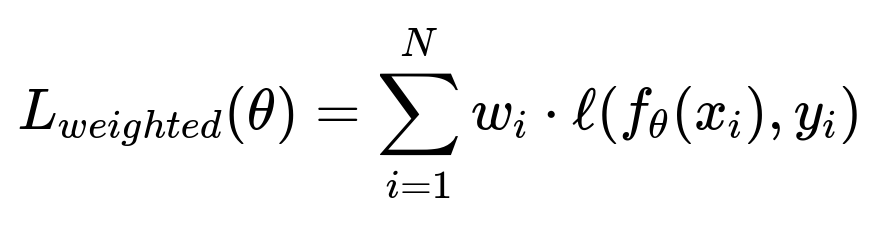 where θ are the model parameters, xᵢ is a training example with label yᵢ, ℓ is the loss term for the prediction, and wᵢ is a weight that is higher for samples from an underrepresented subgroup. Even though the above expression is fairly standard, choosing the proper weighting strategy is critical. If weights are set too high for a particular subgroup, it might degrade performance on the rest of the population.