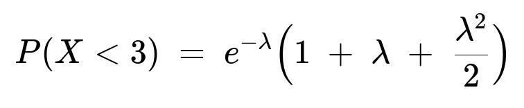 P(X < 3) = e^(-λ) (1 + λ + λ^2 / 2).