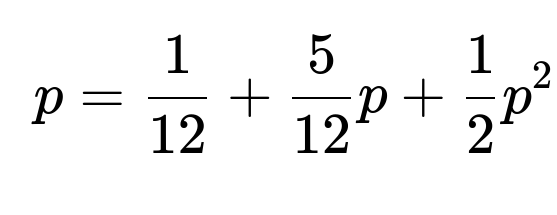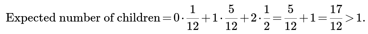In the problem at hand, the expected number is 17/12>1, so it is a supercritical case. That’s why the extinction probability is less than 1 (namely 1/6).