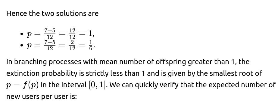 The chance of “blowing up” in user count: This is simply the complement of extinction probability, which in this case is 5/6. That 5/6 figure is the probability that the app’s user count never returns to zero and presumably “survives” indefinitely in the idealized model.