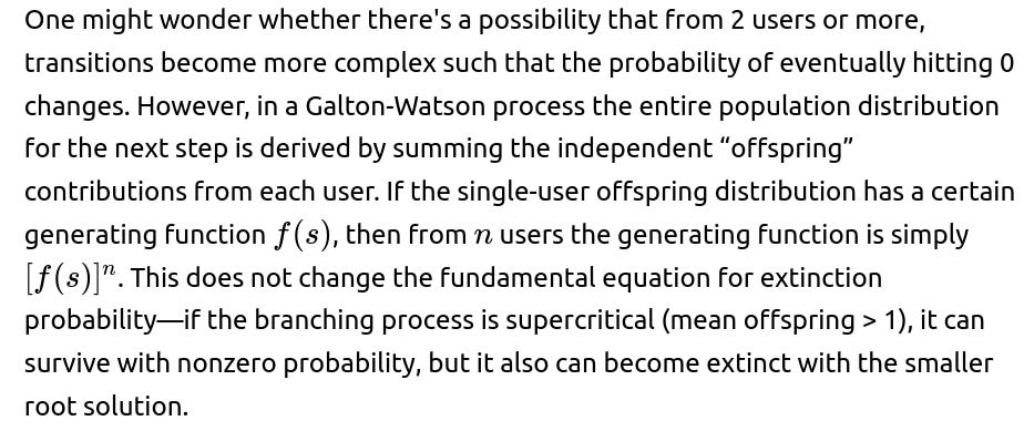 Sometimes, an app’s first user is “special” (like a founder or a power user) who might have different odds of attracting new users than a typical user. This breaks the i.i.d. assumption at the heart of a standard Galton-Watson model. The process might be described by a multi-type branching process where “type A” user is the founder who has one distribution of offspring, while “type B” users have a different distribution. The extinction probability then depends on the interplay between these user types.