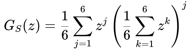 G_S(z) = (1/6) Σ_{j=1 to 6} z^j [ (1/6) (z + z^2 + z^3 + z^4 + z^5 + z^6) ]^j.