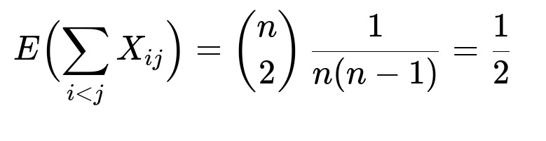 Knowing that the expected value is 1/2 no matter how large n gets can inform us that certain pairwise “swap events” remain vanishingly likely for each pair as n increases, but the sheer number of pairs compensates exactly to keep a constant expected total.