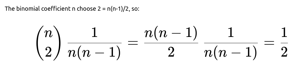 Indeed, the identity arises from summing 1/[n(n-1)] over all n(n-1)/2 pairs. This can be recognized as a particular instance of a more general identity involving cycle counts in permutations, or as a direct combinatorial argument about how each pair i, j can be arranged. The deeper combinatorial perspective sees each pair of positions as having a 1/n(n-1) chance to be a 2-cycle in the permutation. A pitfall might be to treat the result as purely coincidental without realizing it reflects a broad principle: the expected count of r-cycles in a random permutation of n distinct elements is 1/r. That “1/2” for 2-cycles is just a specific instance of that principle.