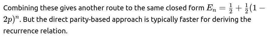 • If it was odd before (Oₙ), it remains odd with probability 1 - p (we get tails), and flips to even with probability p (heads). • If it was even before (Eₙ), it flips to odd with probability p and stays even with probability 1 - p.
