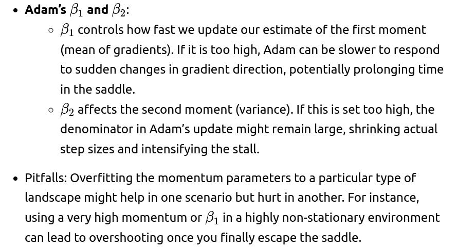 Pitfalls: This benefit is highly context-dependent and not something we intentionally seek. Prolonged stalling can waste computational resources and might never yield a better solution if the saddle is truly suboptimal.