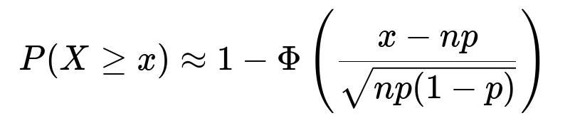 Here, X is the binomial random variable, x is the observed count of boys, n is 10^6, p is 0.5, and Φ is the cumulative distribution function (CDF) of the standard normal distribution. Plugging x = 508,000, n = 10^6, p = 0.5 gives us a Z-value = (508,000 − 500,000) / 500 = 16. Consulting standard normal tables, 1 − Φ(16) is on the order of 10^−58, indicating it is virtually impossible under an assumption of p = 0.5.