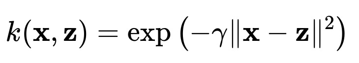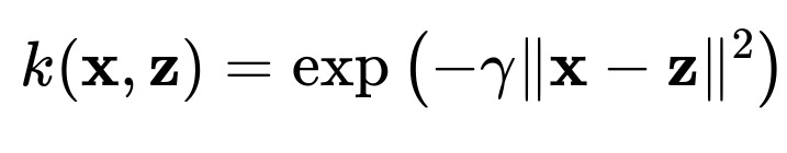 where (\gamma > 0) is a parameter that controls the width of the Gaussian influence. This kernel can map a single point in the original space to an infinite-dimensional Hilbert space, yet computations remain feasible because you only ever need the scalar value of (k(\mathbf{x}, \mathbf{z})).