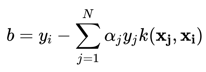 When you move to the dual form, the bias (b) can be found by ensuring the Karush–Kuhn–Tucker (KKT) conditions hold for support vectors that lie on the margin. In practice, once the (\alpha_i) values are learned, you choose a support vector with (\alpha_i > 0) (and typically less than C if a soft margin is used) and solve for (b). In the dual representation: