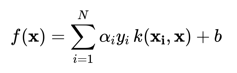 Here, (N) is the number of training examples, (\alpha_i) are the learned Lagrange multipliers, (y_i \in {-1, +1}) are the class labels, and (k(\mathbf{x_i}, \mathbf{x})) is the kernel function.