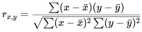 Below is the mathematical expression for Pearson’s correlation coefficient, which is a common way to measure linear correlation between two continuous variables x and y.