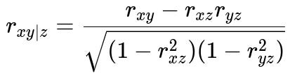 Here, r_{xy} is the correlation between x and y, r_{xz} is the correlation between x and z, and r_{yz} is the correlation between y and z. If r_{xy|z} is small but r_{xy} is large, it suggests that x and y were primarily correlated because of z.