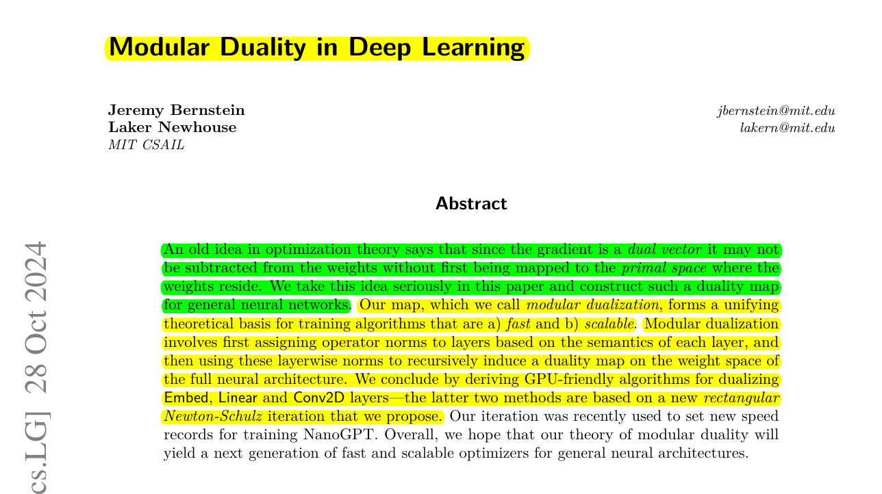 • Introduces "modular dualization" - a systematic way to construct duality maps for neural networks