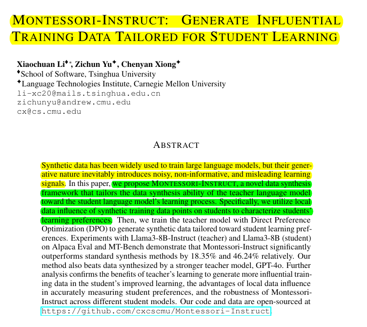 Montessori-Instruct, a novel data synthesis framework uses student feedback to train teacher LLMs to generate better synthetic training data