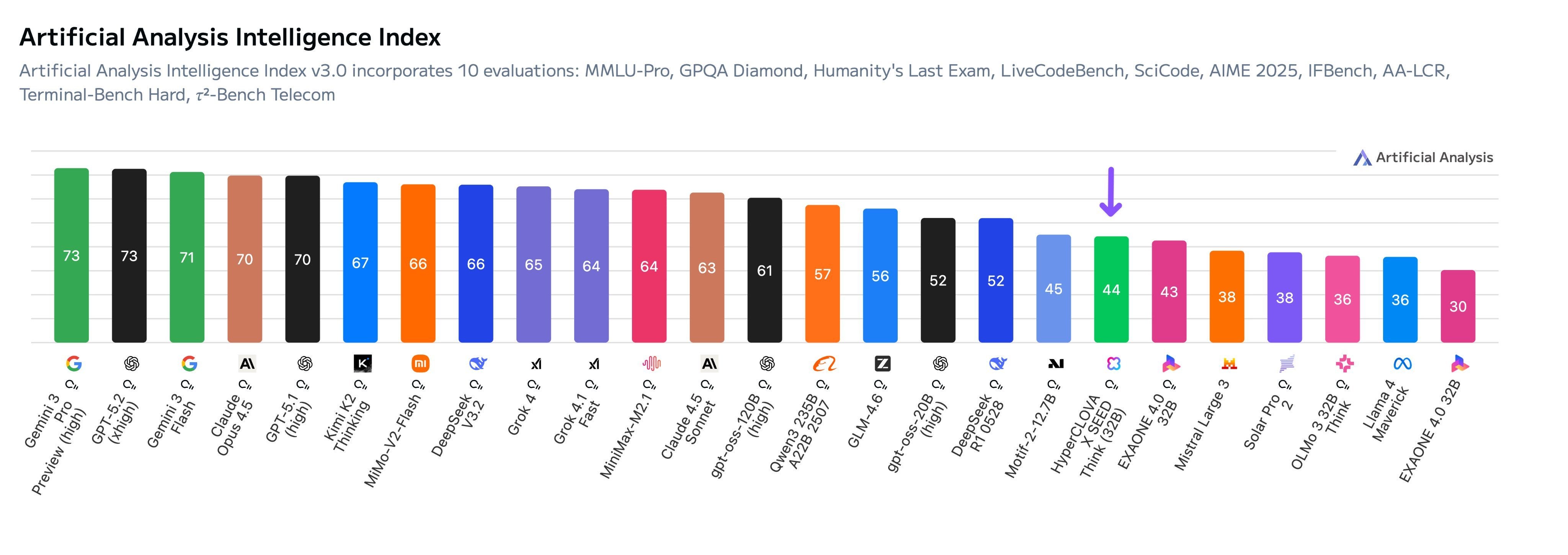 Naver, a South Korean internet giant, has just launched HyperCLOVA X SEED Think, a 32B open weights reasoning model that scores 44 on the Artificial Analysis Intelligence Index. This model is one of the strongest South Korean models, and outperforms EXAONE 4.0 32B, a previous Korean model leader