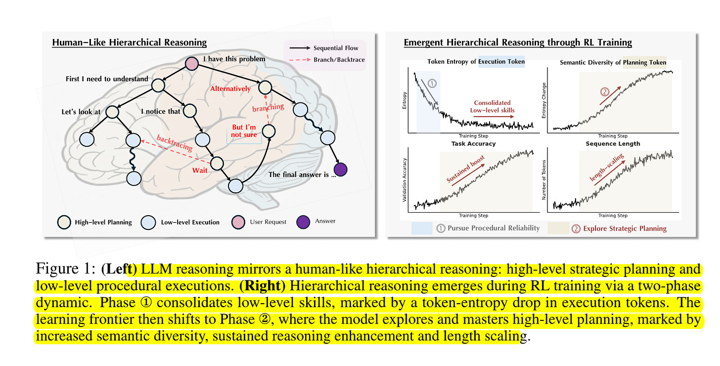 This paper shows that reasoning improves with RL because learning happens in two distinct phases. First, the model locks down small execution steps, then it shifts to learning planning. That “hierarchical” view is their first new insight.