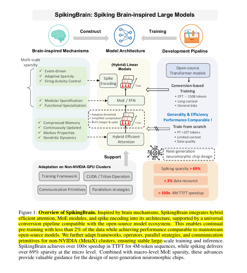 SpikingBrain replaces most quadratic attention with linear and local attention, mixes in selective full attention where it matters, and adds an adaptive spiking activation so the model computes only on meaningful events.