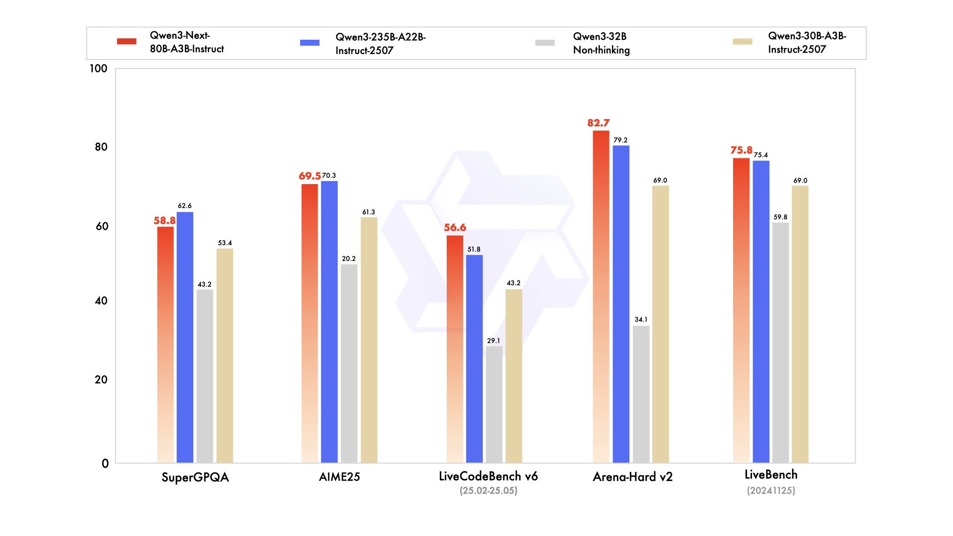 Qwen3-Next-80B-A3B-Instruct significantly outperforms Qwen3-30B-A3B-Instruct-2507 and Qwen3-32B-Non-thinking, and achieves results nearly matching our flagship Qwen3-235B-A22B-Instruct-2507.