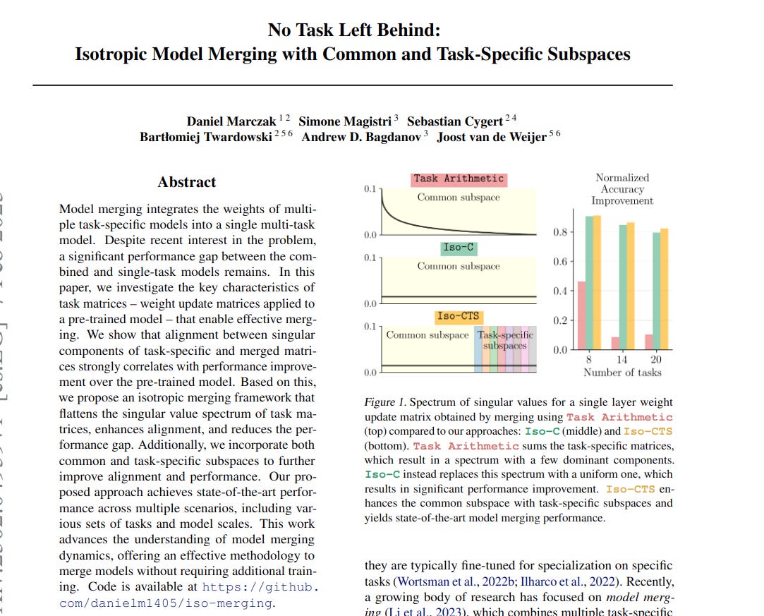 📌 Iso-CTS method practically combines common and task-specific subspaces. This simple yet effective approach reaches state-of-the-art model merging results across diverse tasks and model scales.