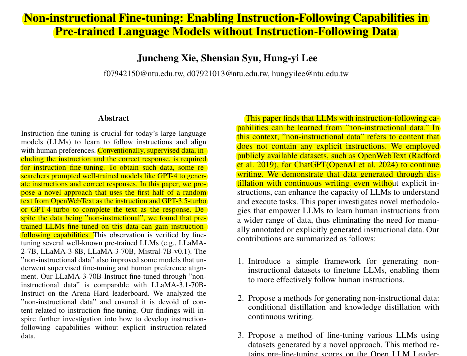 • Proposes using "non-instructional data" to enable instruction-following capabilities in pre-trained LLMs