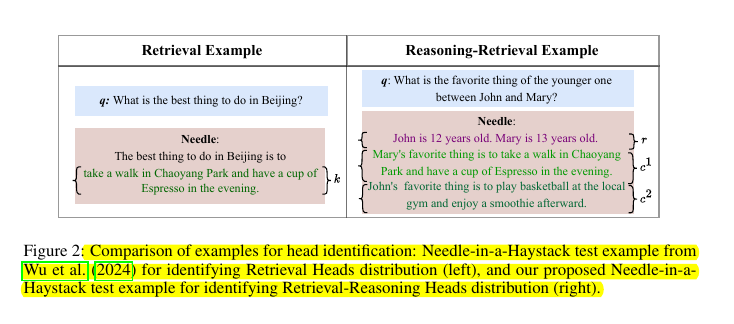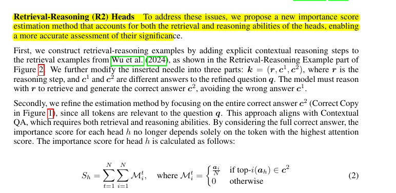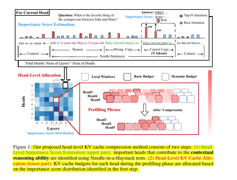 🔍 The method operates in two key steps: First, it estimates head importance scores using Needle-in-a-Haystack tests that evaluate both retrieval and reasoning abilities.