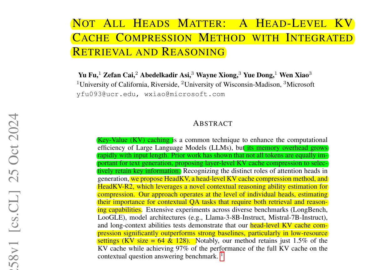 • HeadKV: Compresses KV cache at individual head level instead of layer level